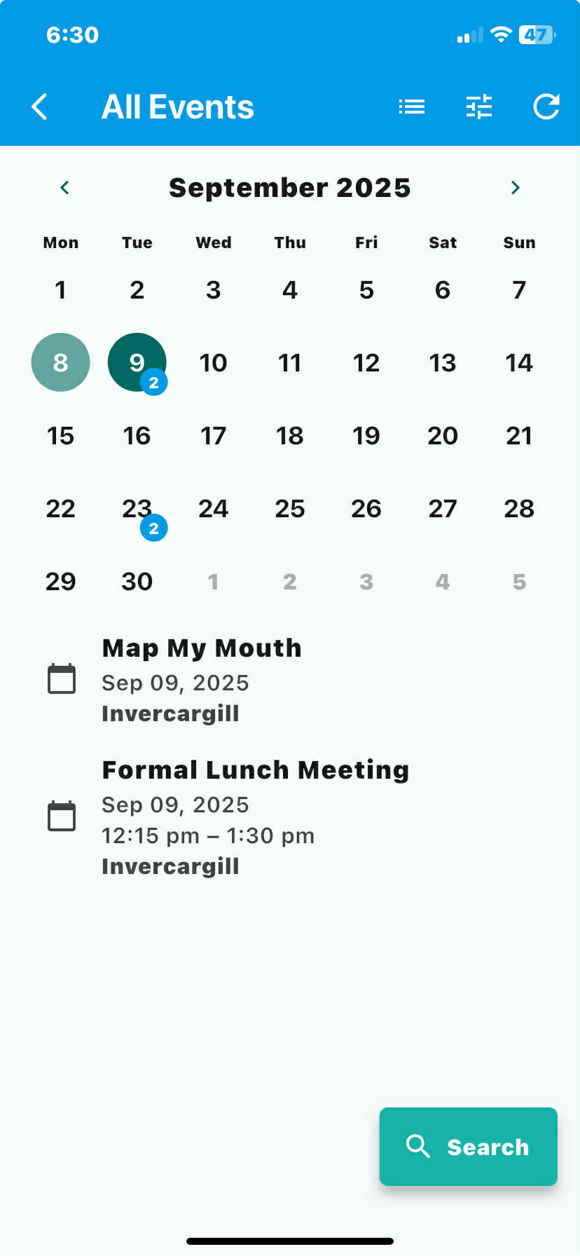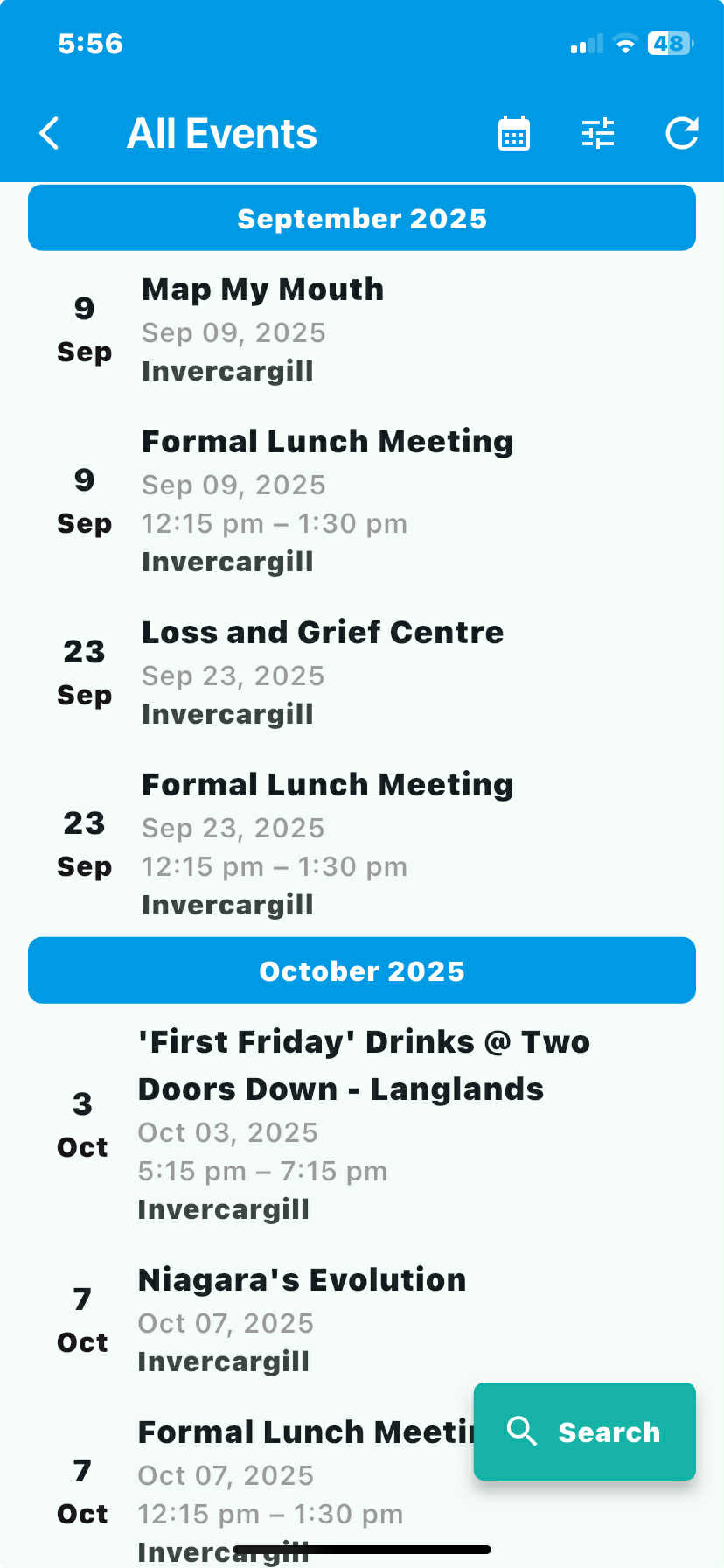 Club events as loaded into Club Website pull through to the App and upcoming events are marked blue